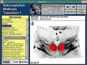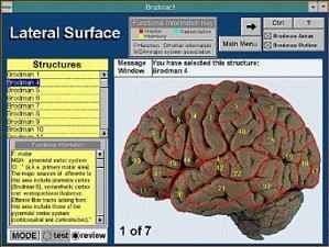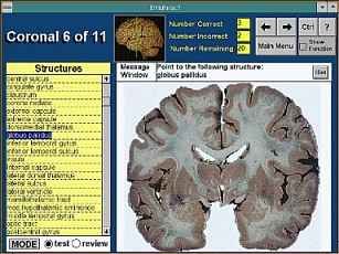 In Review Mode you can click on the name of a structure from a list and the corresponding area will be highlighted on-screen. Or, you can click on an area in the brain section and be shown the name of that structure. Functional Information is available by clicking on the Show Function button.