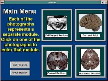 Brainiac! consists of four different modules. These include Gyri, Coronal. Horizontal and Pal-Weigert stained sections -- There are over 50 screens of brain sections.