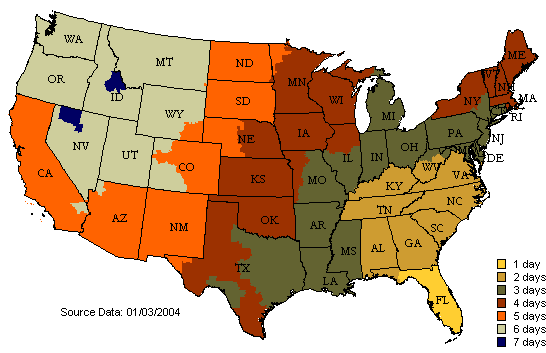 Charges are computed by weight and are automatically determined when you add products to the shopping cart. Transit times for UPS standard Ground service are shown in the map below. Transit days do not include Saturdays, Sundays or UPS holidays. Deliveries are not made on Saturday or Sunday. Rural or remote destinations require additional transit time and delivery surcharges charges. Extended Area Surcharges for specific zip codes are shown here.